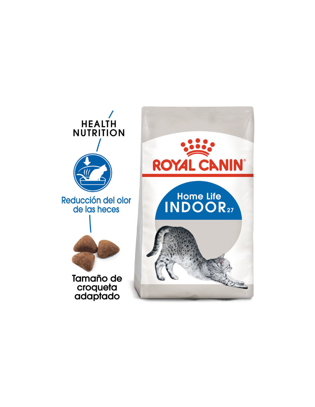 - Royal Canin Indoor 27 es un alimento seco diseñado para gatos adultos que viven en espacios interiores.